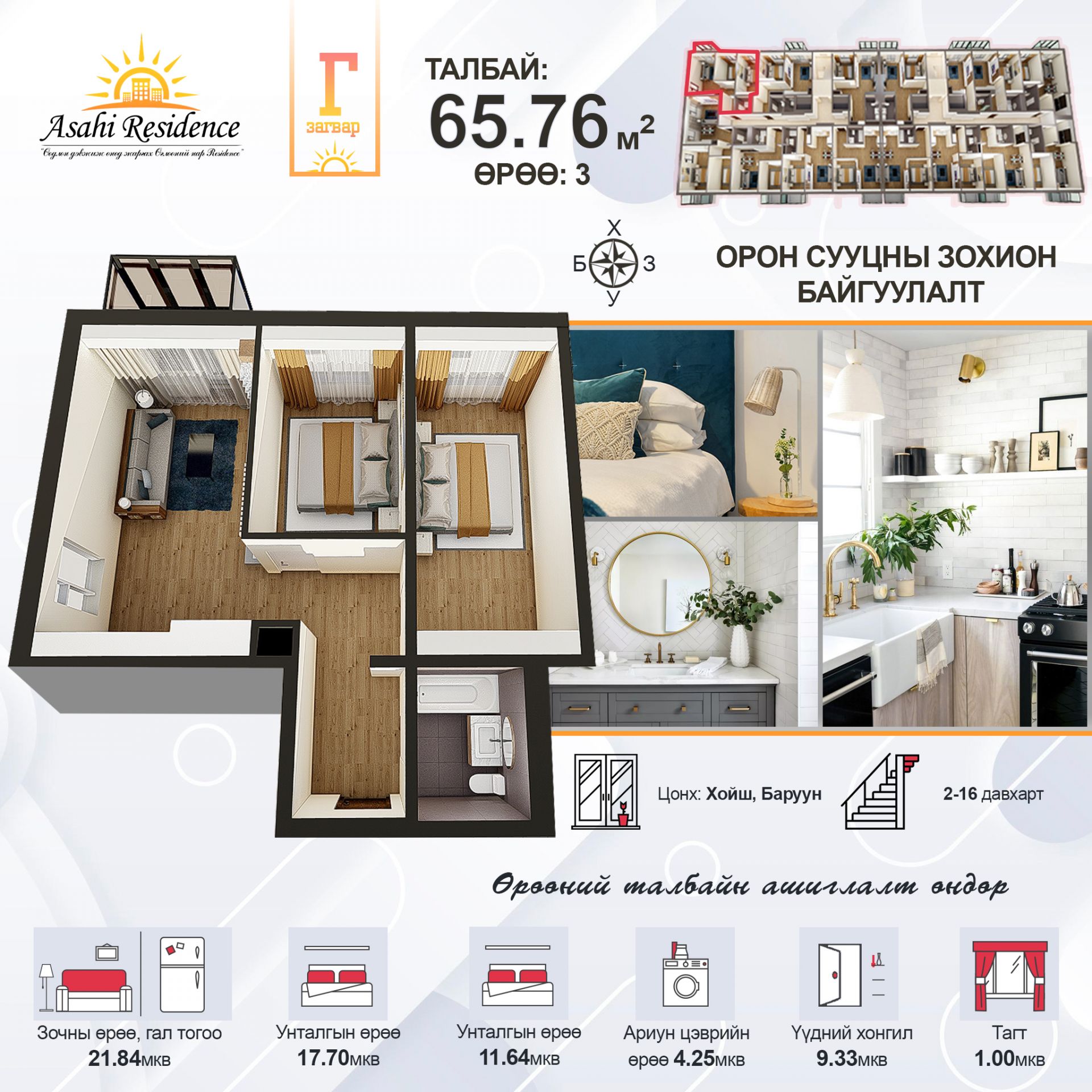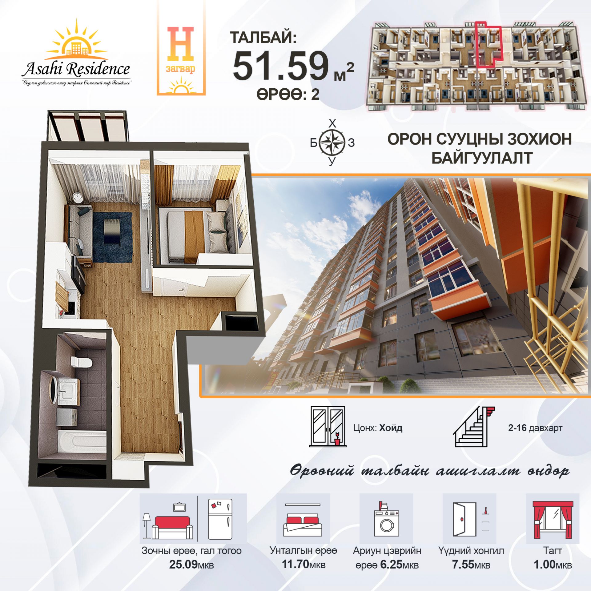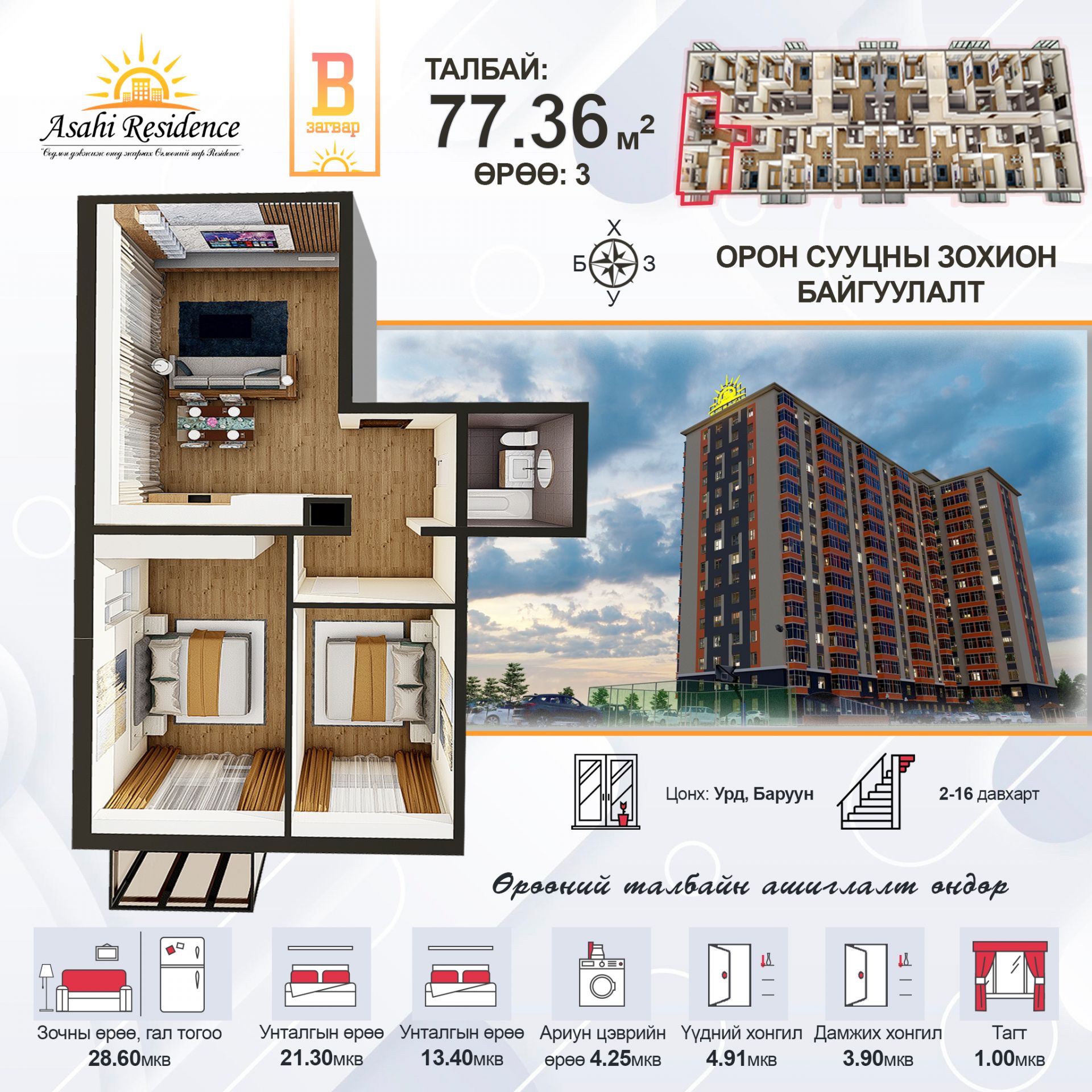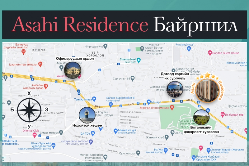 Дүүхээ ХХК компанийн 2 дахь төсөл болох сүндэрлэн буй Asahi Residence. Баянзүрх дүүргийн 10-р хороо, Ботаникийн автобусны буудлын чанх хойно Амгалан цогцолбор сургуулийн яг хажууд үйлчилгээтэй 345-н айлын 2 блок орон сууц, 2024 оны 3 улиралд ашиглалтанд орно.